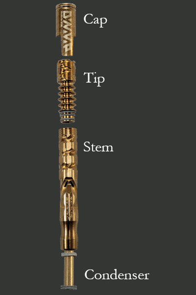 Cleaning your Dynavap is straightforward. Start by disassembling your device; each component is held together by simple friction, so you can just pull them apart.